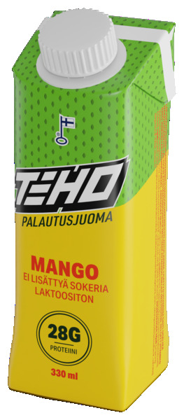 TEHO palautusjuomat on valmistettu suomalaiseen laktoosittomaan lähimaitopohjaan. Tuotteet on jaettu käyttöyhteyden perusteella kahteen konseptiin: voima- ja kestävyysharjoitteluun. TEHO Mango palautusjuoma on suunniteltu tukemaan palautumista voimaharjoittelusta tai toimimaan proteiinipitoisena välipalana. Raikkaan mangon maku tekee palautumisesta nautinnollista ja vastaavaa makua ei markkinoilta löydy! Juoma ei sisällä lisättyä sokeria, vaan ainoastaan maidon luonnollisen sokerimäärän. Yksi pakkaus sisältää runsaasti proteiinia, eli 28 g ja vain 5,0 g/dl hiilihydraatteja.